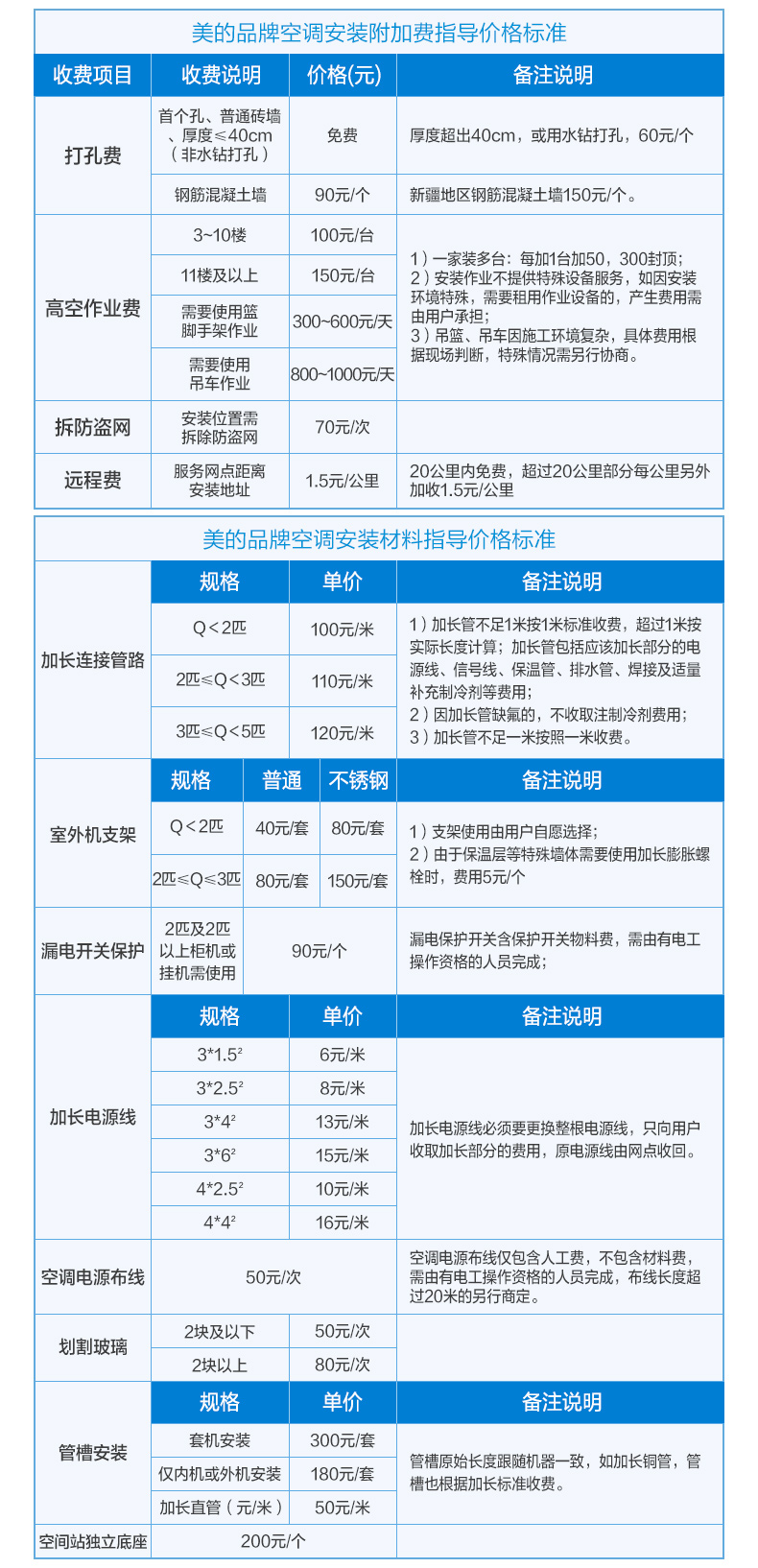 下面的美的空調官方安裝收費標準: